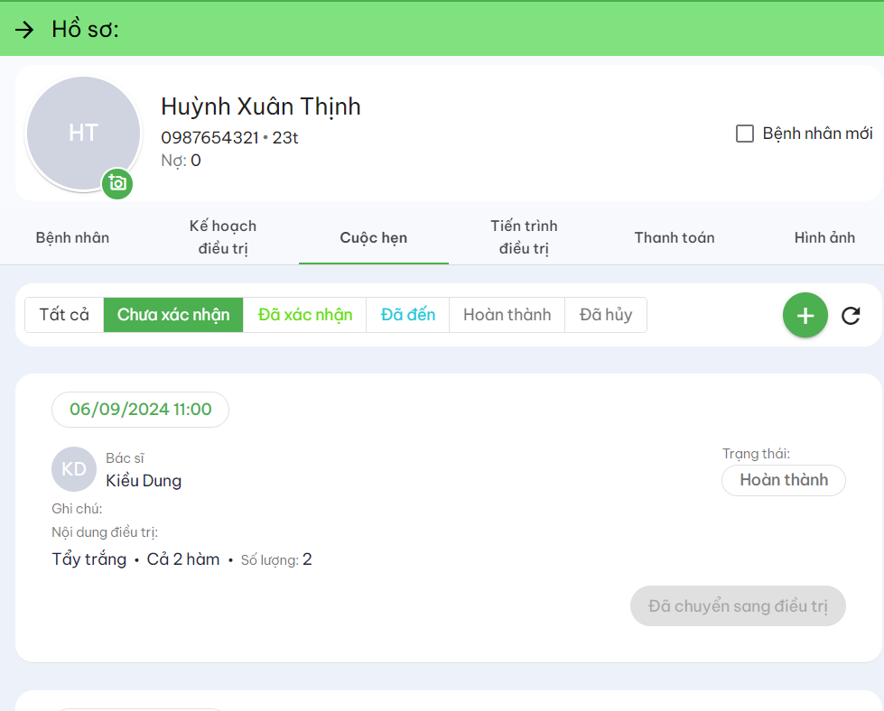 Tại mục hồ sơ bệnh nhân, click chuột vào ''cuộc hẹn '' để tạo cuộc hẹn.