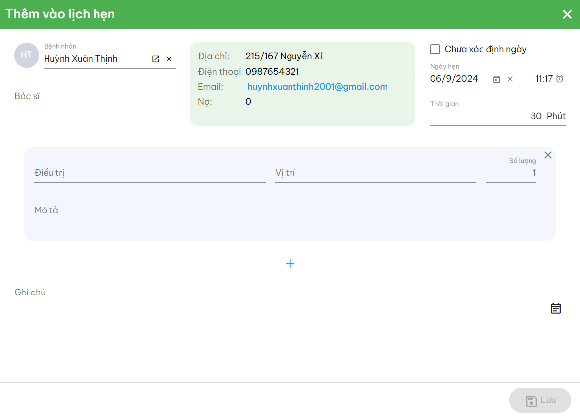 Tại đây, click ''<img src="https://4288754487-files.gitbook.io/~/files/v0/b/gitbook-x-prod.appspot.com/o/spaces%2FxhaRps1wcesQsYRhgBEy%2Fuploads%2Fr75dQL7K3JYTaZsQdl2S%2Fscreenshot_1725594220.png?alt=media&#x26;token=923ce759-7f66-43ba-b4ea-ea7a016c1fff" alt="" data-size="line">'' để thêm cuộc hẹn