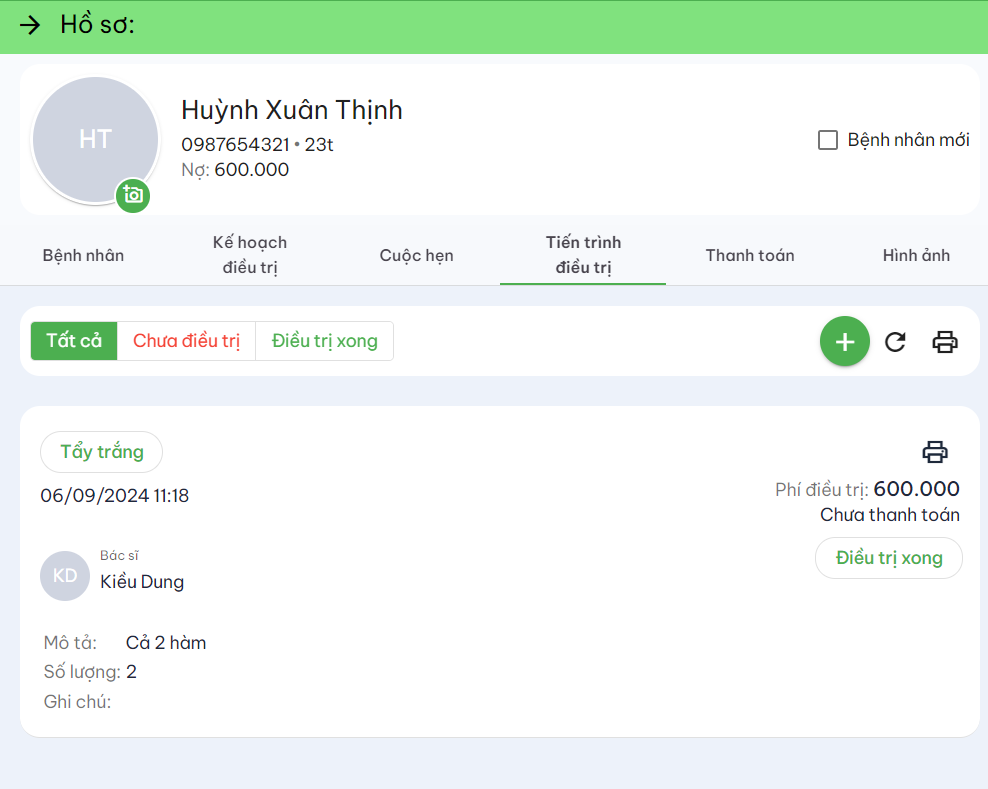 Tại mục hồ sơ bệnh nhân, click chuột vào ''tiến trình điều trị'' để tạo cuộc hẹn.